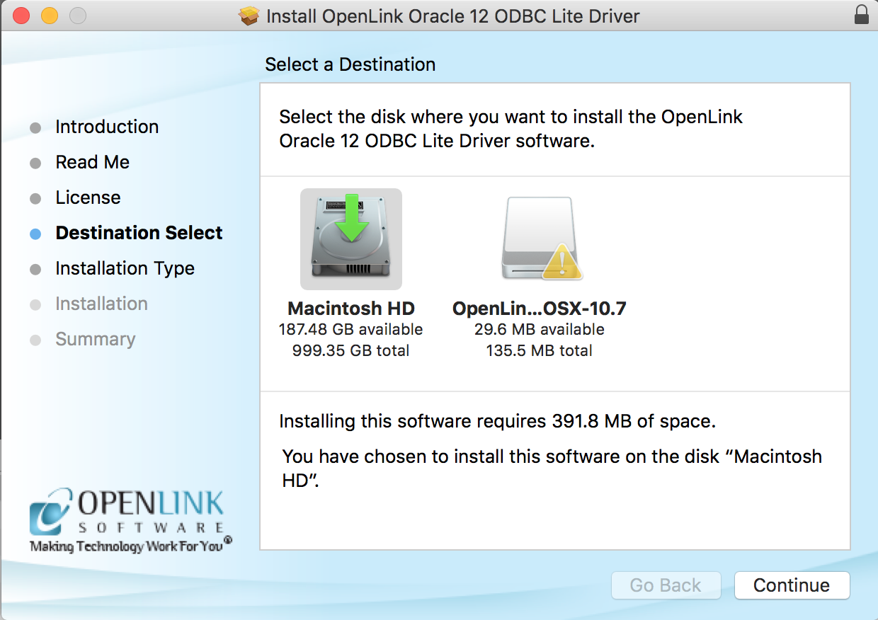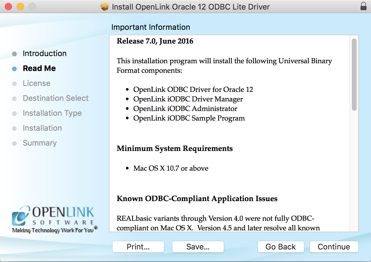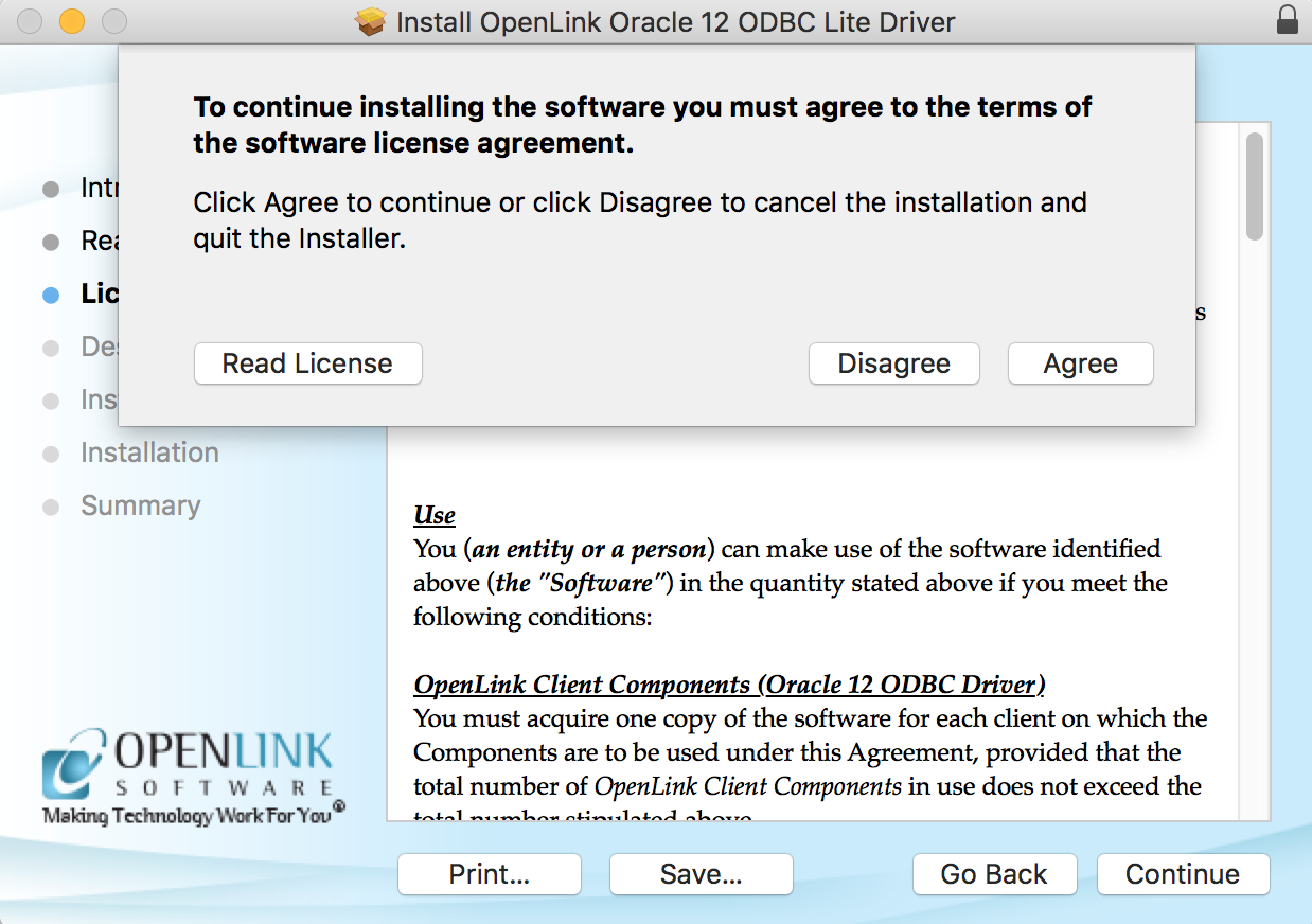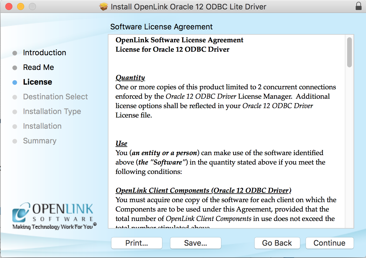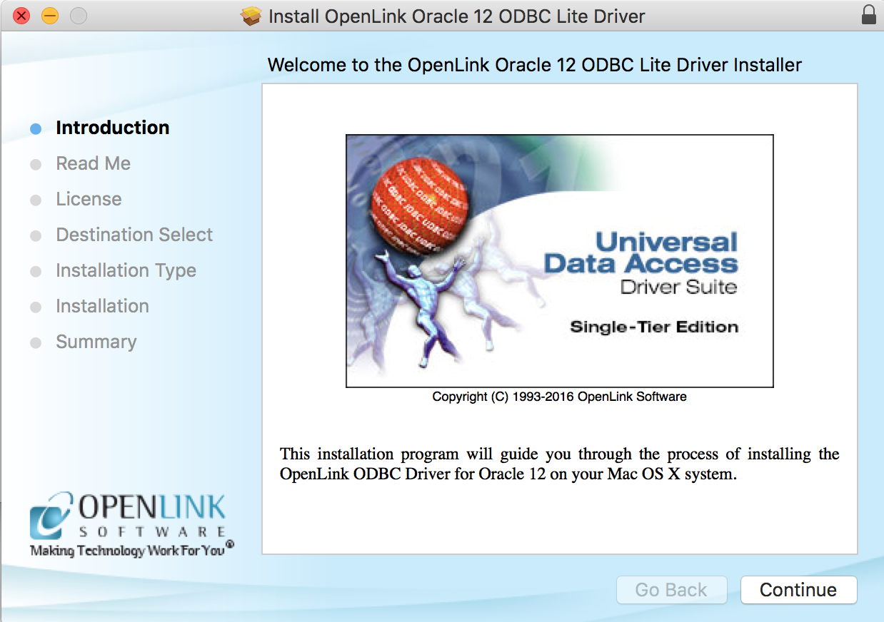 OpenLink Single-Tier Driver for ODBC. Please read and click "Continue."