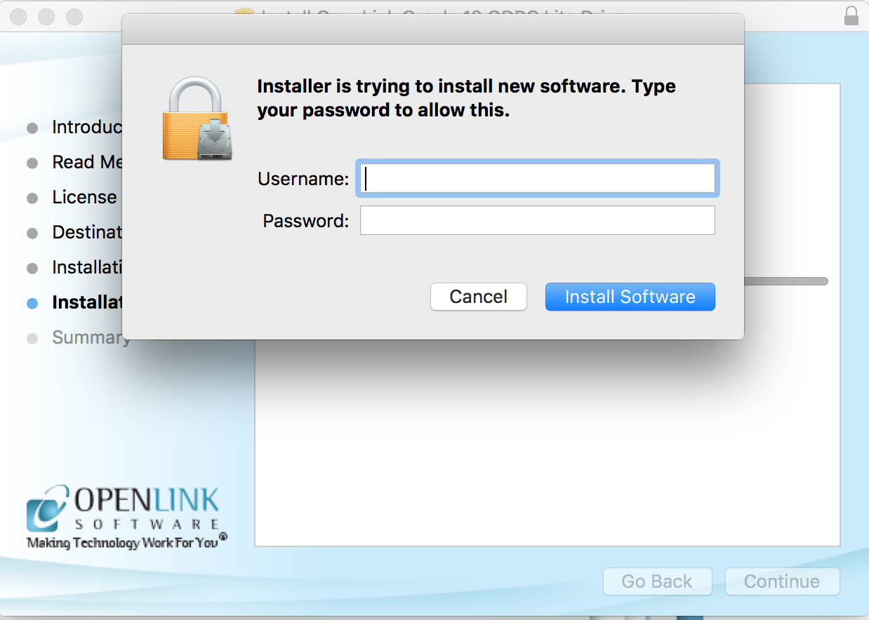 OpenLink driver. Enter your Mac OS X Username and Password.