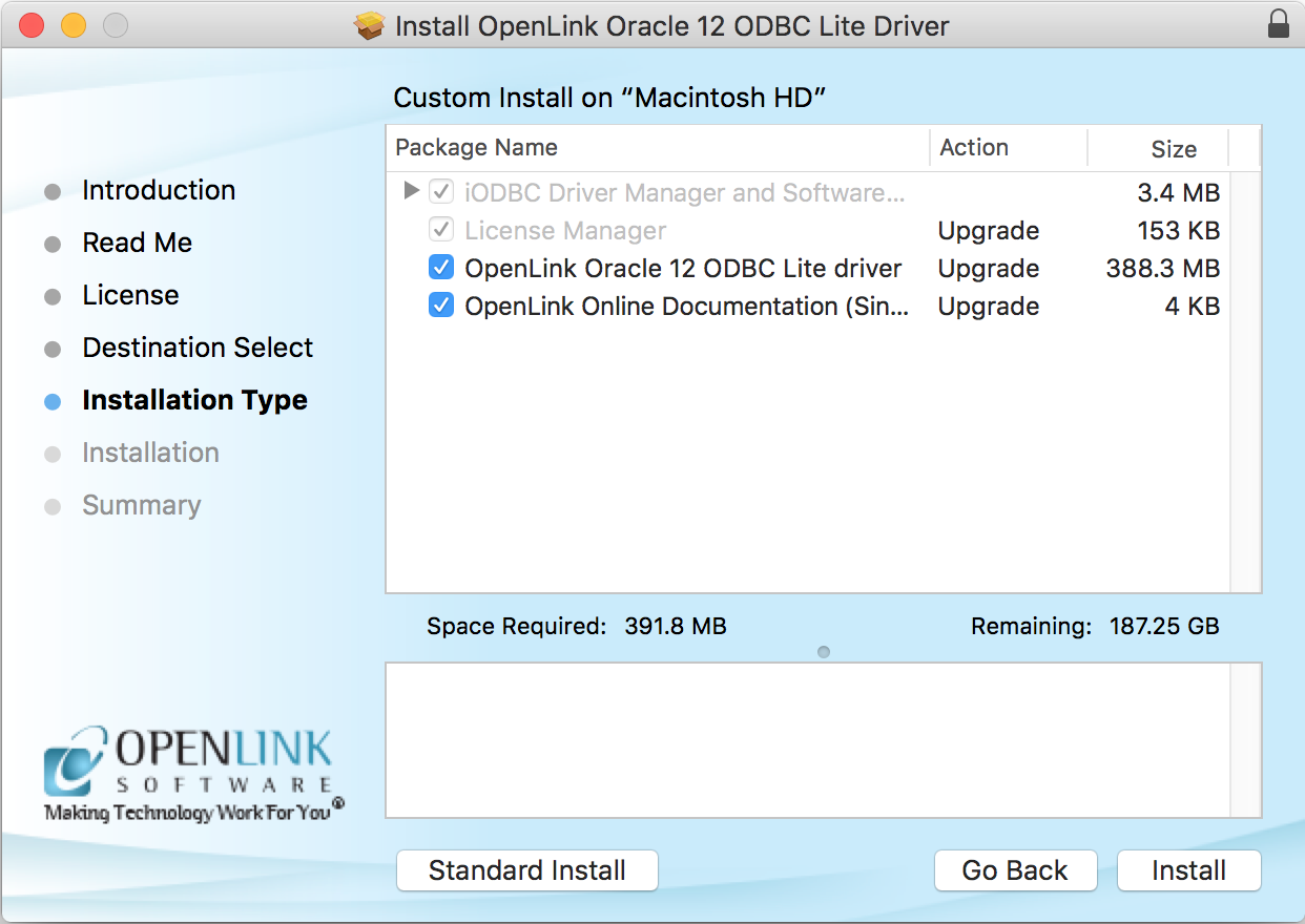 OpenLink or iODBC components in the past, click "Upgrade" to continue; otherwise, click "Install."