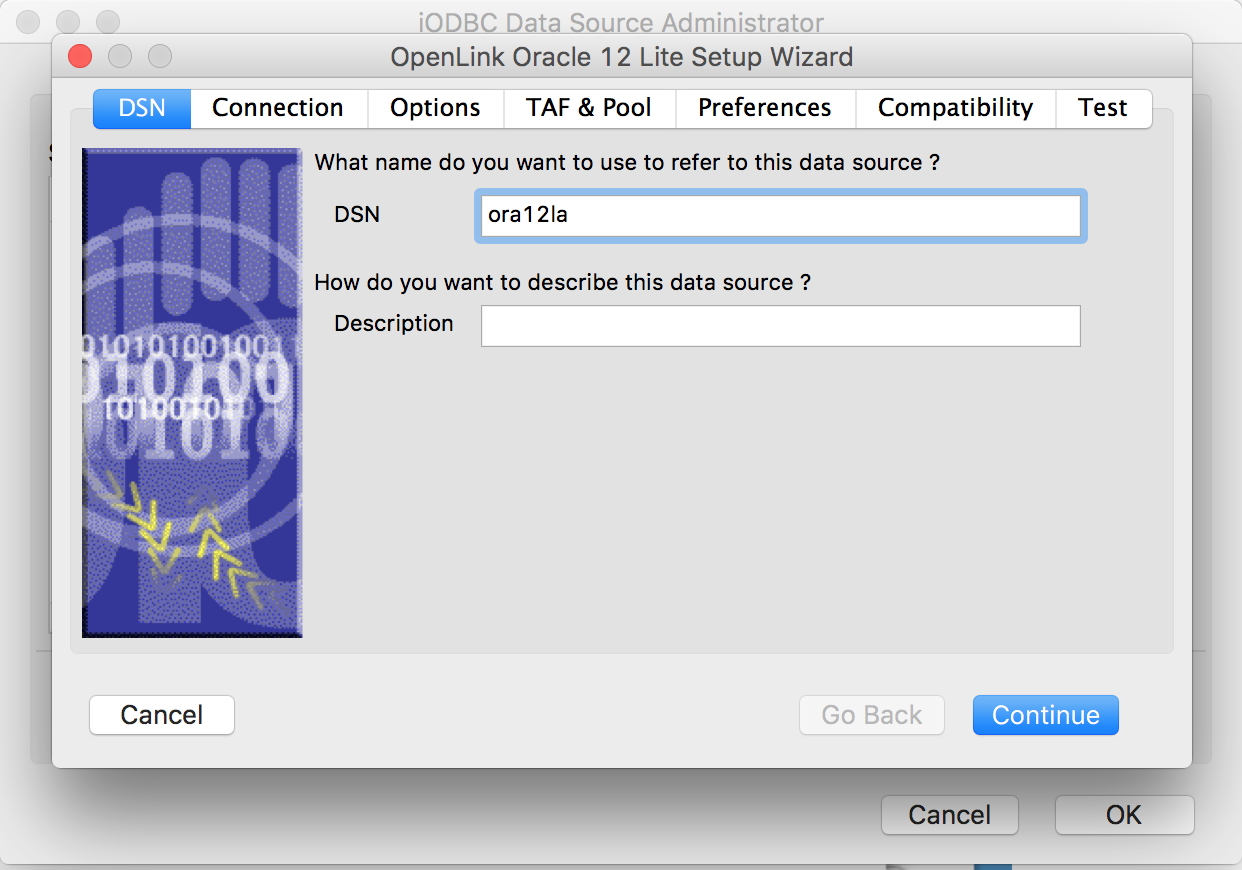 - The Data Source tab requests a name for your Data Source and you may also supply an optional description for your Data Source Name.