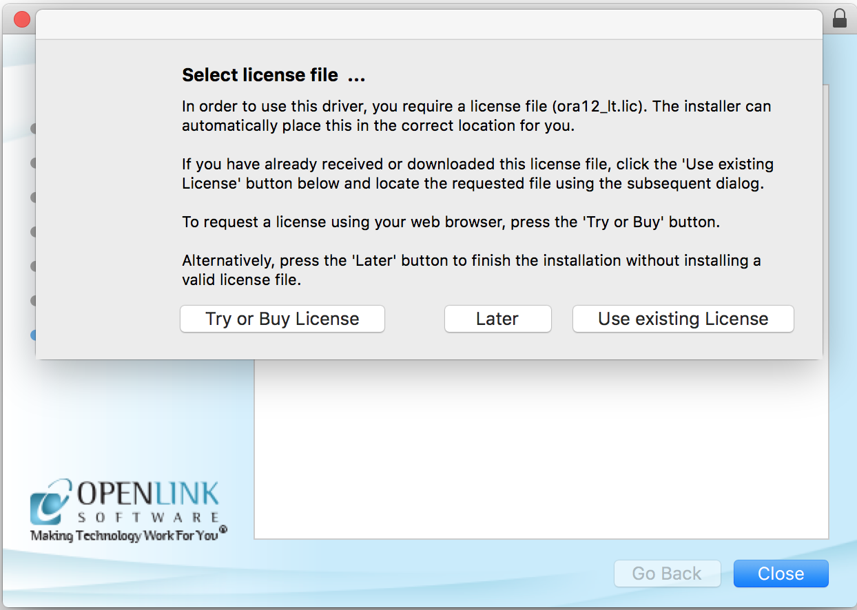 NOTE -- If a correctly named file already exists in $OPL_LICENSE_DIR, /Library/Application Support/OpenLink/Licenses/, you will not see this dialog. If the existing file is not valid (evaluation has expired, it's for a different OS, it permits insufficient processor cores, etc.), you will need to manually apply a valid license file after installation is completed.