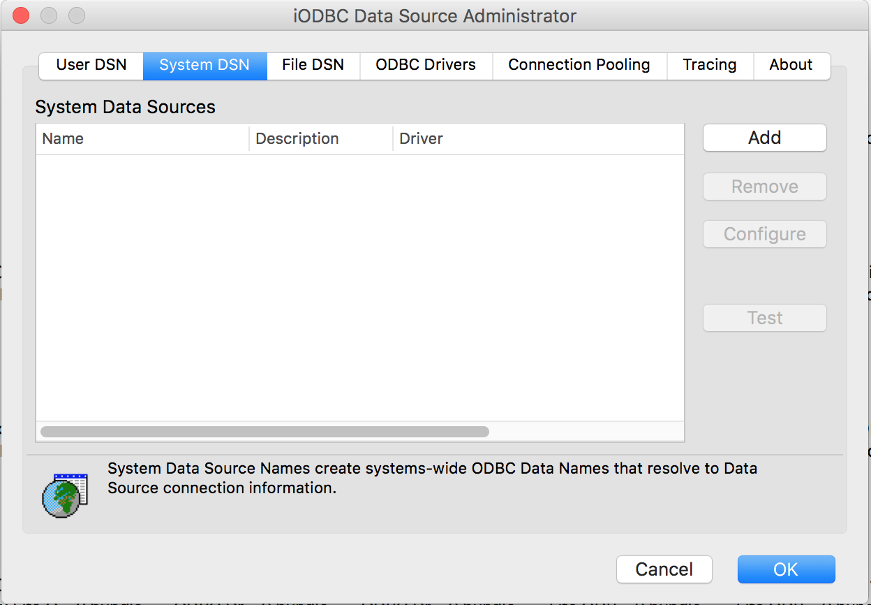 OpenLink iODBC Administrator located in the /Applications/iODBC folder: