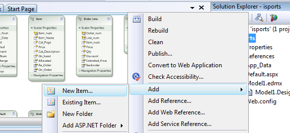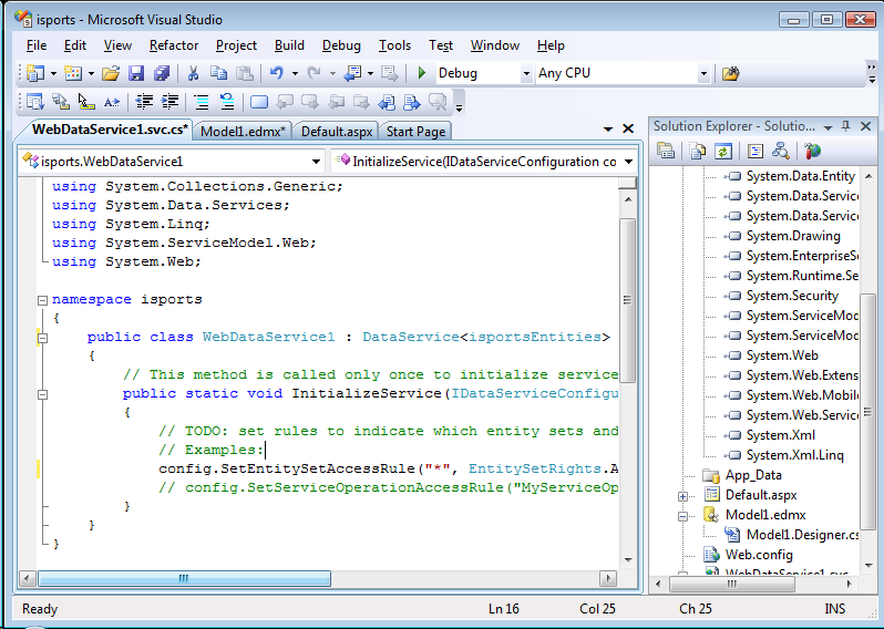 In the newly created WebDataService1.svc.cs file, add the data source class name of isportsEntities (note this is the name set in the Creating EDM in Visual Studio 2008 section) as the