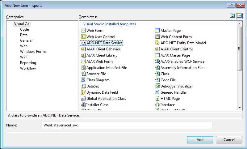 Give it the name WebDataService.svc and click Add to create the ADO.Net Data Service.